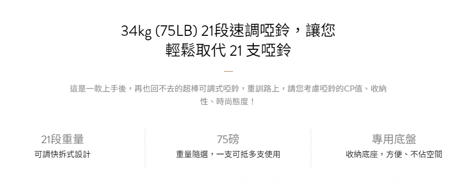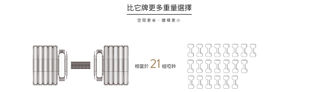 • 4.5kg、5.6kg、6.8kg、9kg、10.2kg、11.3kg、13.6kg、14.7kg、15.8kg、18.1kg、19.2kg、20.4kg、 22.6kg、23.8kg、24.9kg、27.2kg、28.3kg、29.48kg、31.7kg、32.8kg、34kg 21段重量秒速調整,21 in 1 調整啞鈴