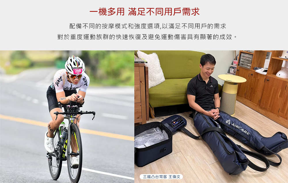 無論是跑步、單車、羽球...其他運動,AirCare深層氣壓按摩,迅速提升血液循環,幫助肌肉恢復,減少酸痛疲勞。